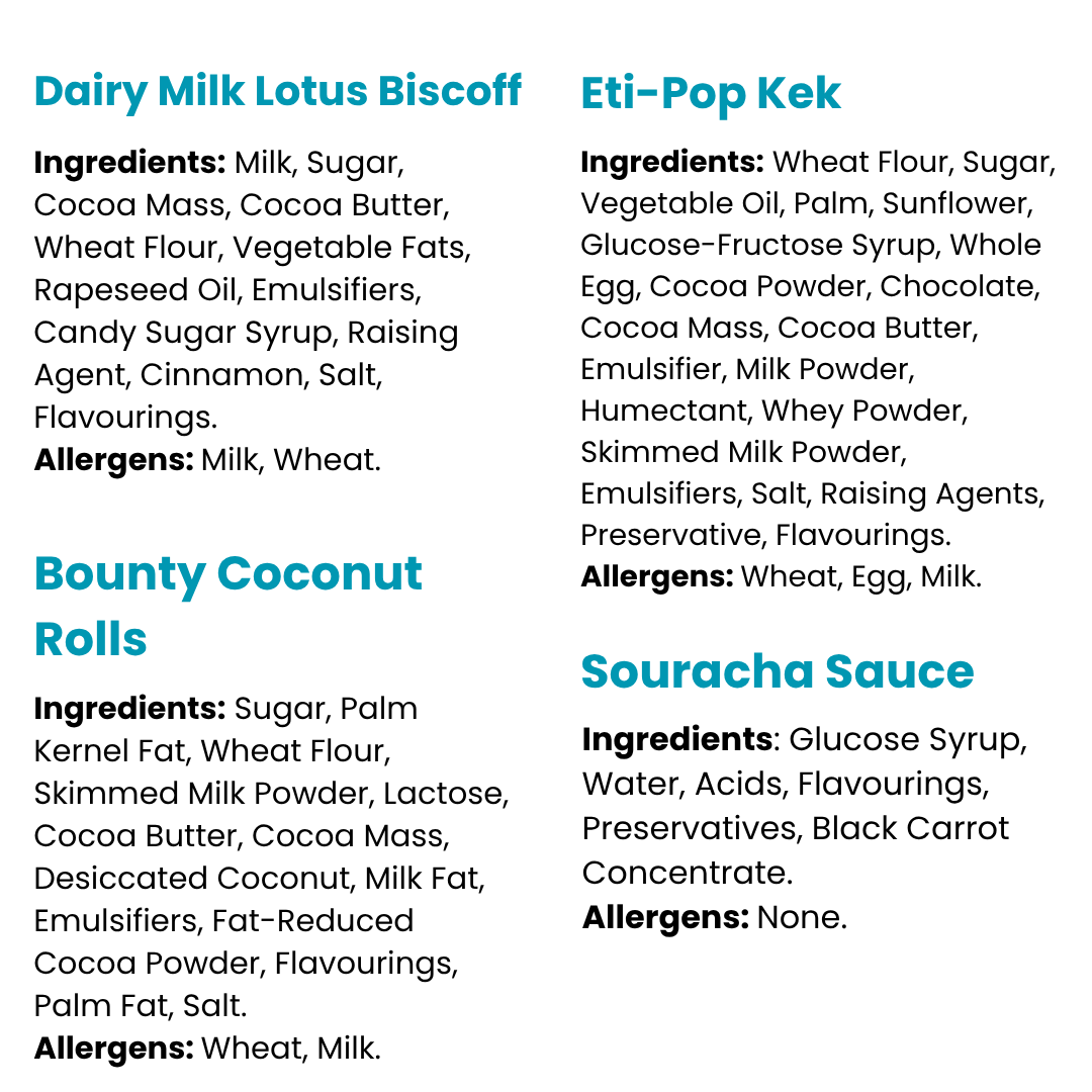 Chamoy Guys Gift Box Dairy Milk Lotus Biscoff , Eti-Pop Kek Chocolate, Bounty Coconut Rolls & Souracha Super Sauce