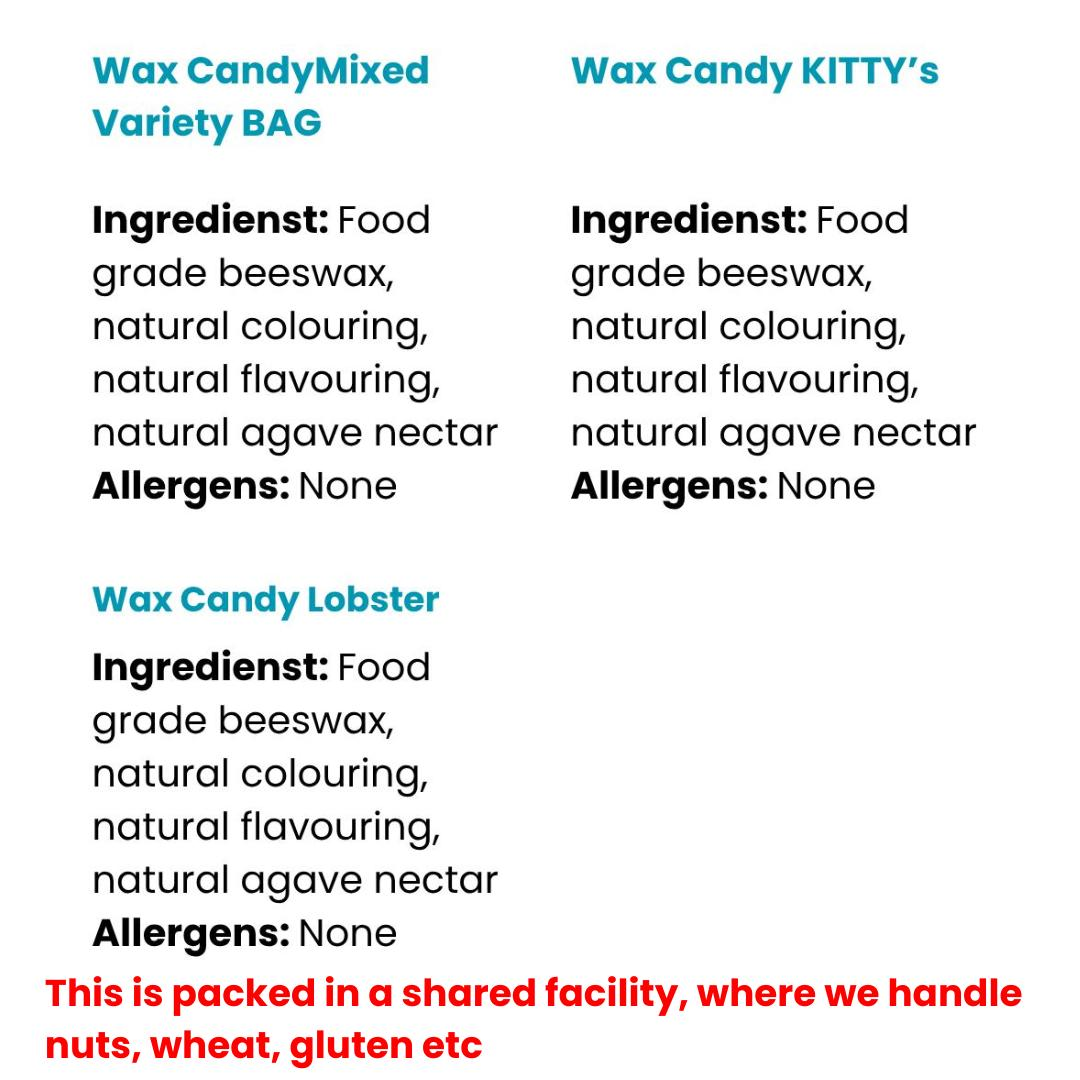 Ingredienst: Food grade beeswax, natural colouring, natural flavouring, natural agave nectar