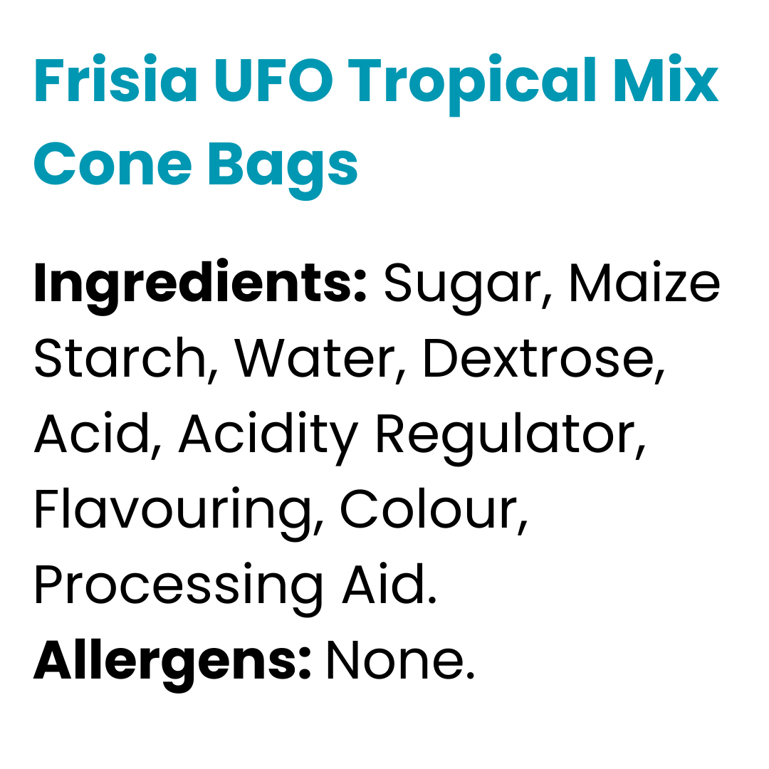 Blast off into a world of fun with Frisia UFO Tropical Mix Cone Bags! These iconic retro sweets are light, crunchy wafer discs filled with tangy, fizzy sherbet that bursts with tropical fruit flavour. Each colourful saucer melts in your mouth, releasing a sweet and sour hit that’s both nostalgic and exciting.